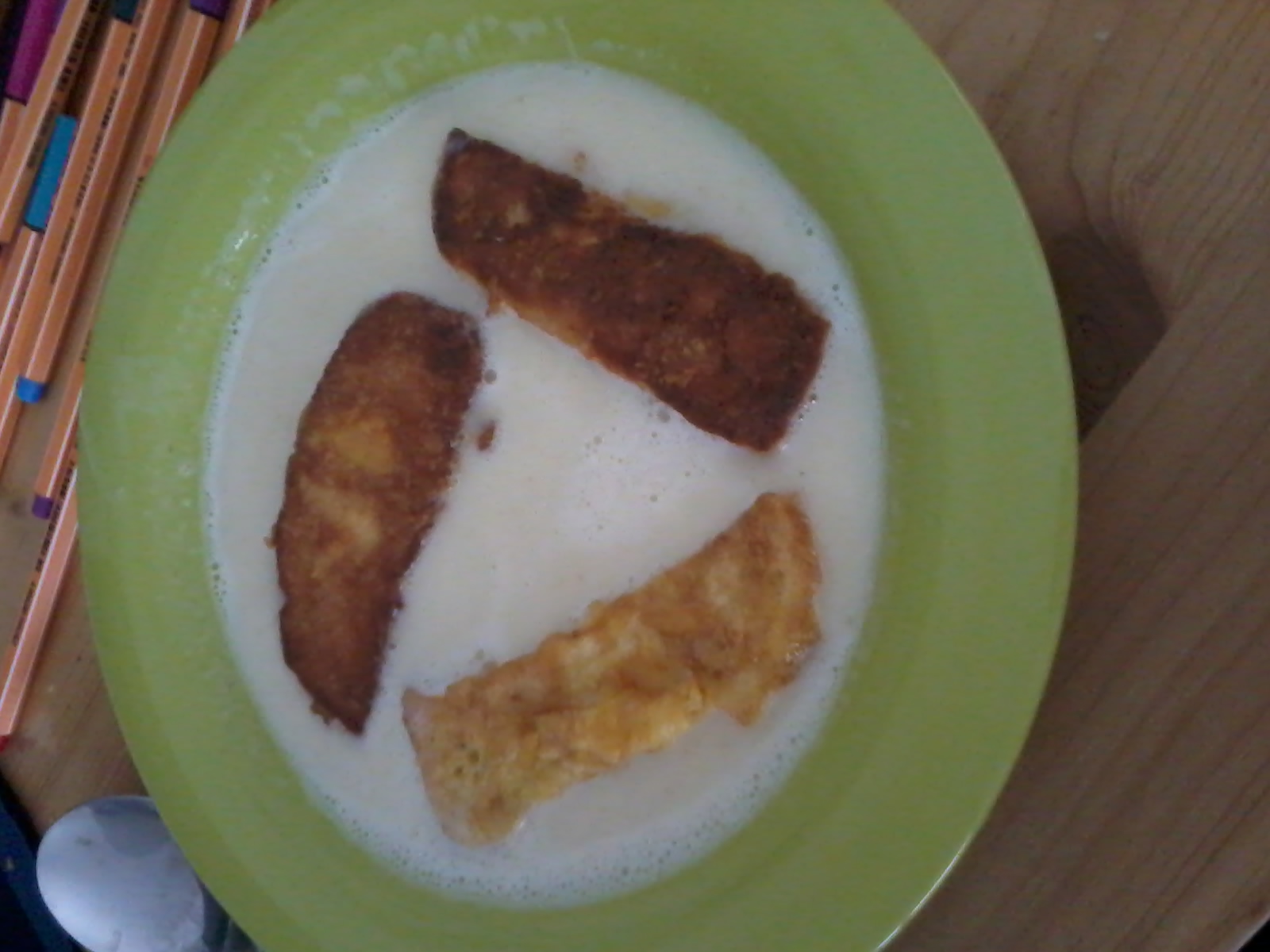 Man nimmt ein (oder zwei oder drei) Ei(er) und vermischt sie mit etwas Wasser oder Milch. Dann reibt man Käse dazu. Einige Scheiben Toastbrot schneidet man zu Stücken, aber nicht zu klein, sonst weicht es zu schnell auf. Man legt die Toaststücke kurz in die Ei-Mischung und backt sie dann mit etwas Öl in einer Pfanne heraus.