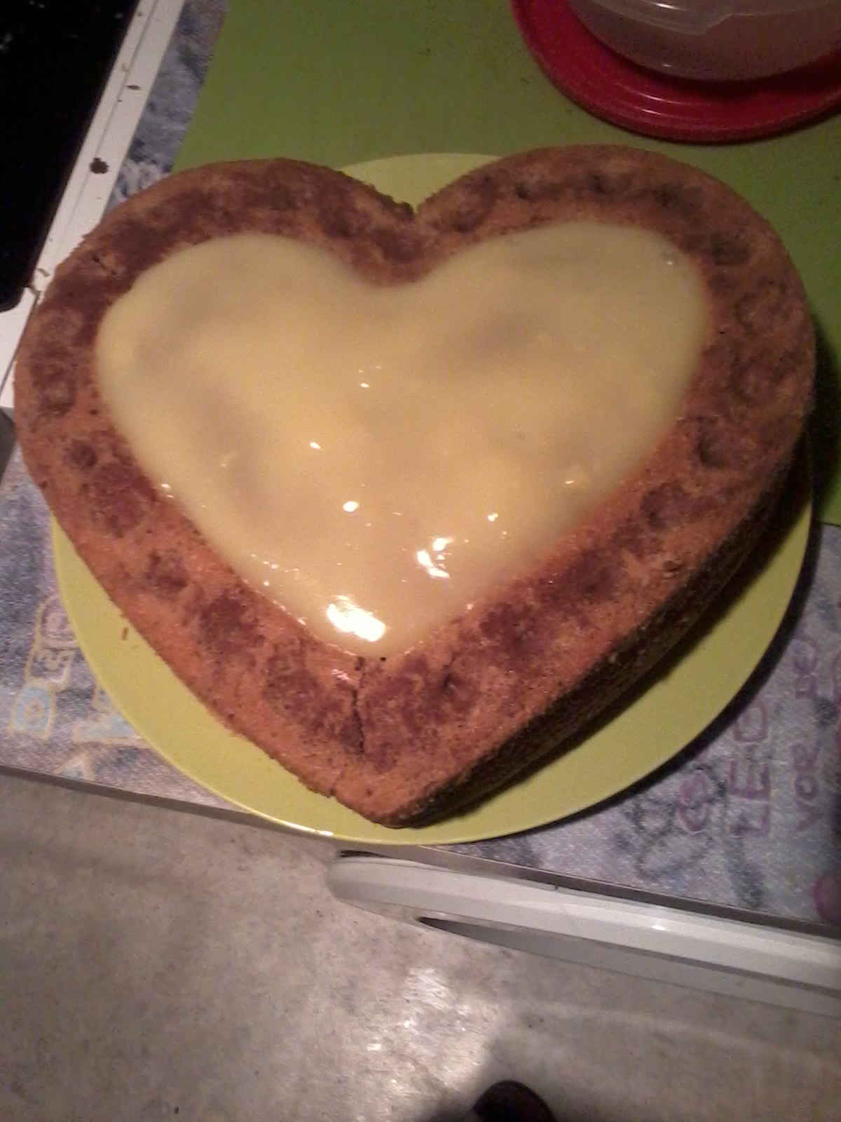 Wenn der Kuchen aus dem Ofen kommt, stürzen und auskühlen lassen. Dann gerade schneiden und waagrecht auseinander schneiden. Den Pudding verteilen und den Kuchen wieder zusammensetzen. Dann restlichen Pudding auf den Kuchen draufstreichen.