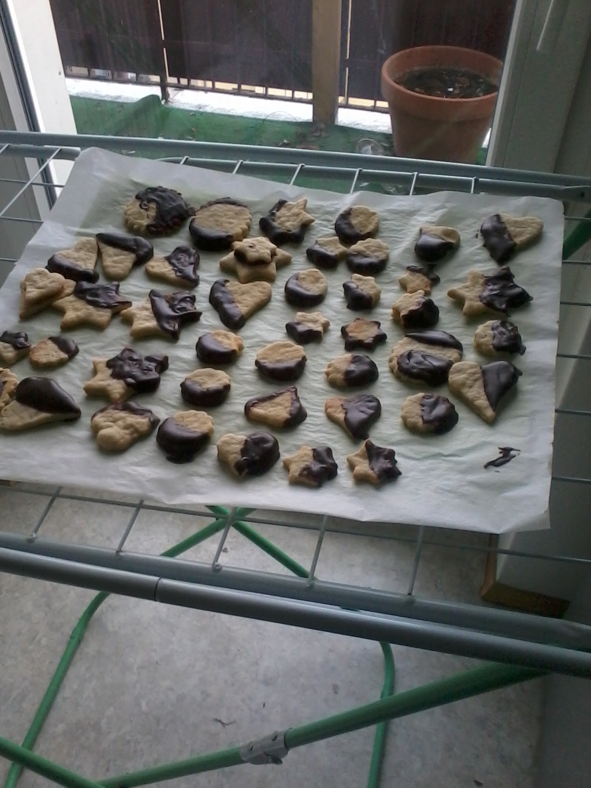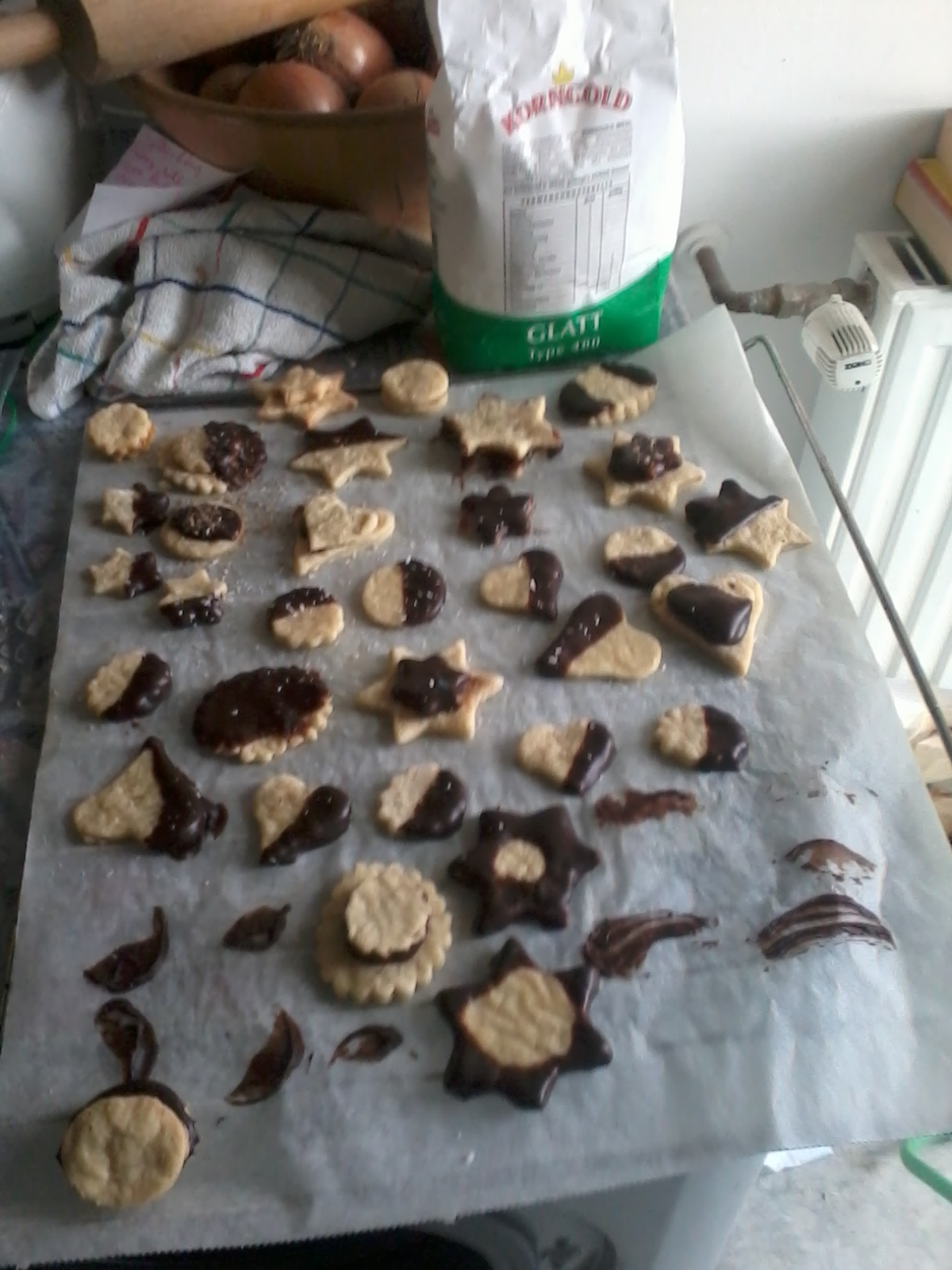 Faul wie ich bin habe ich die Kekse alle eingetaucht. Einige habe ich auch zu Doppelkeksen zusammengeklebt- auch mit der Schoko oder einige auch mit Marmelade.