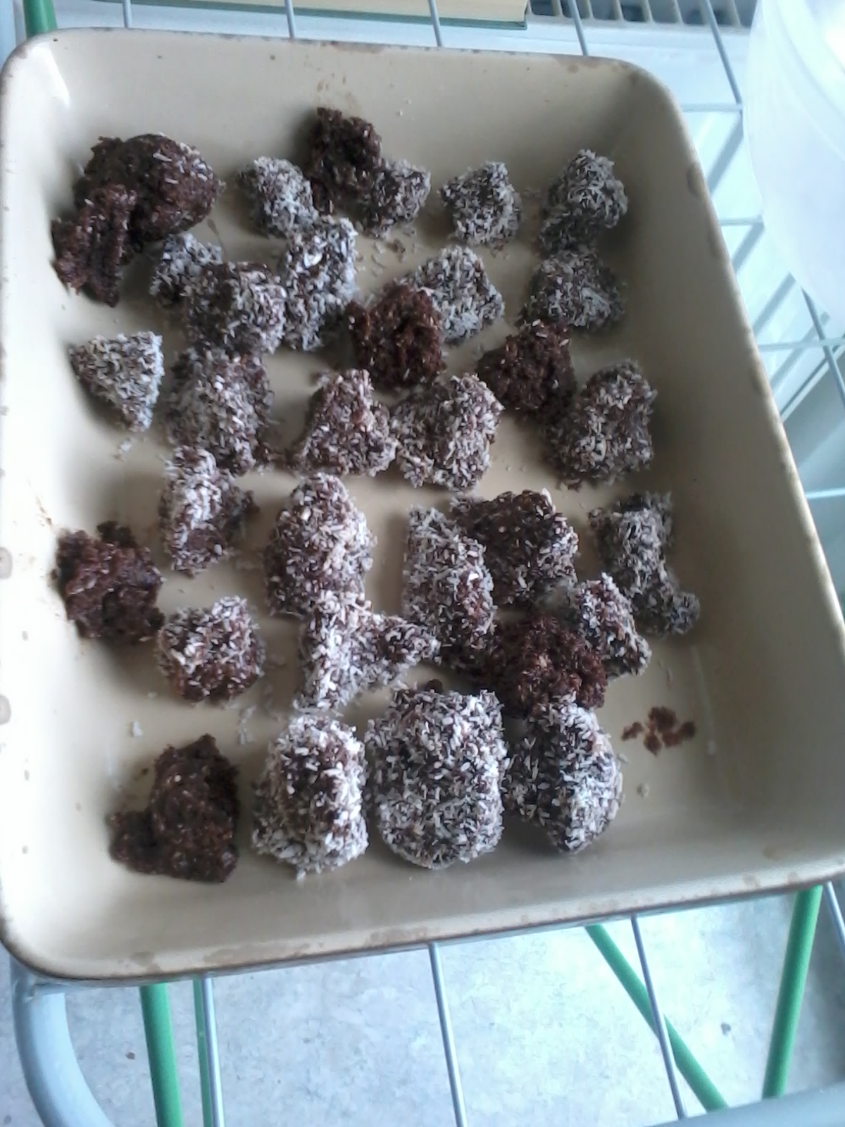 Weil mir noch Schokosoße übrig geblieben ist, habe ich Kokosraspeln dazugemischt, bis das eine weiche, aber formbare Masse wurde. Dann habe ich diese „Kugeln“ nochmal in Kokosraspeln gewälzt und in den Kühlschrank gestellt. So ungesund! Ich liebe es!