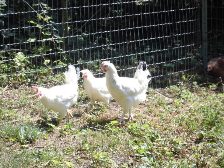 Meine Schwester machte einen Hühnerhaltungskurs und mein Vater baute einen Hühnerstall (okay, möglicherweise war er doch nicht zufrieden, er hat ziemlich viel geflucht). Fehlten nur noch die Hühner. Die Mitarbeiterinnen meiner Mutter schenkten ihr Gutscheine für Hühner- mit der Bedingung, dass sie die Namensgeberinnen sein durften (okay, das war vermutlich auch nur ein Scherz, aber die drei sind so lieb, da tut man ihnen jeden Gefallen).