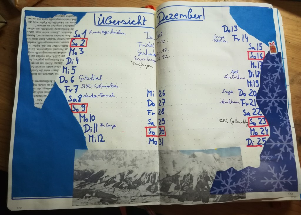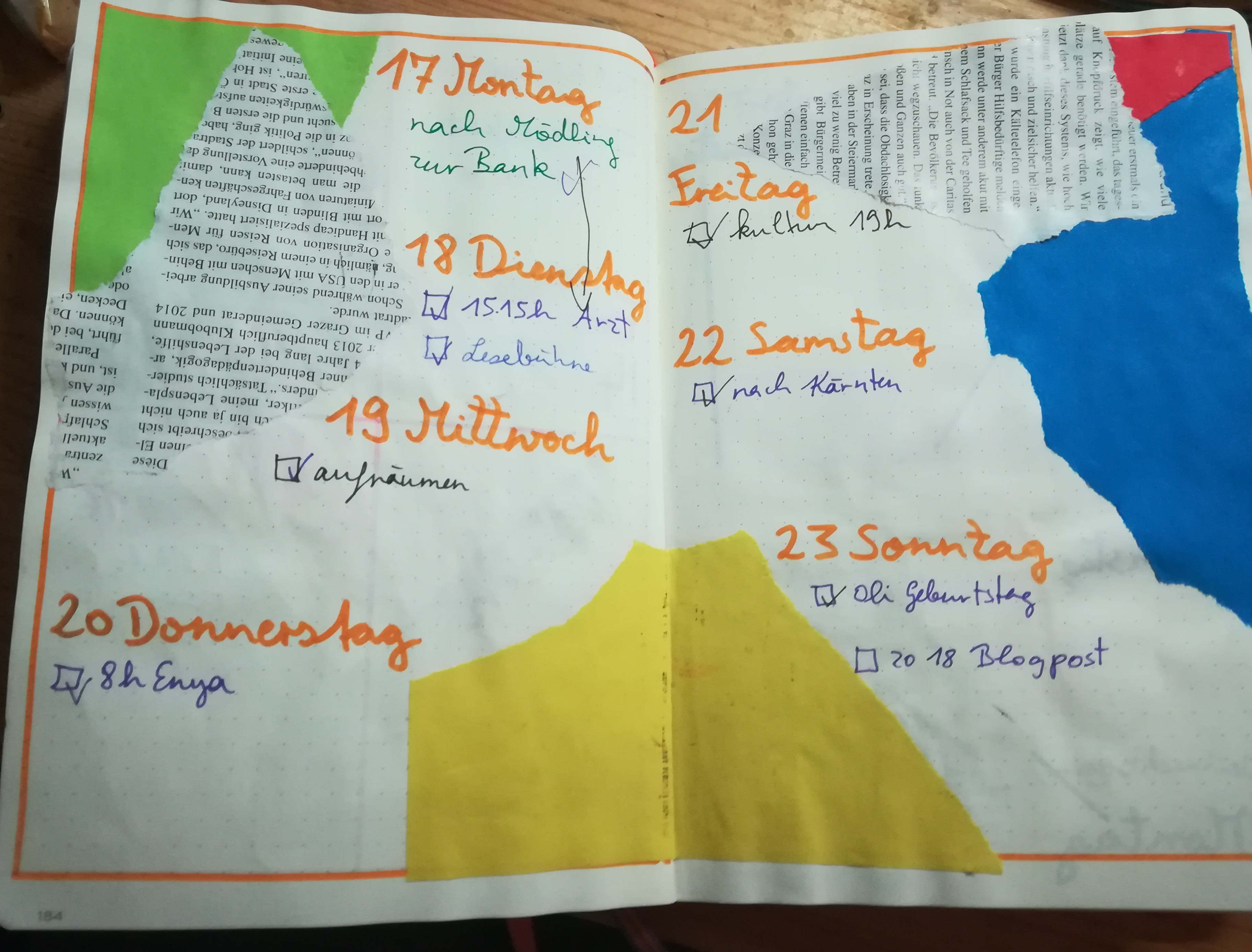 Jetzt ist das Bullet Journal natürlich zeitintensiv. Das will ich nicht. Ich will es einfach, aber ich will auch, dass es halbwegs gut ausschaut, nur für mich, für niemanden sonst. Ich muss es gerne in die Hand nehmen. Also bereite ich vor, wenn ich mal Zeit dafür habe. Und dann darf es ruhig mal aufwendiger sein. Aber es ist nicht durchgehend so und nur wenn ich grade Lust darauf habe. Sonst eben nicht. Aus.