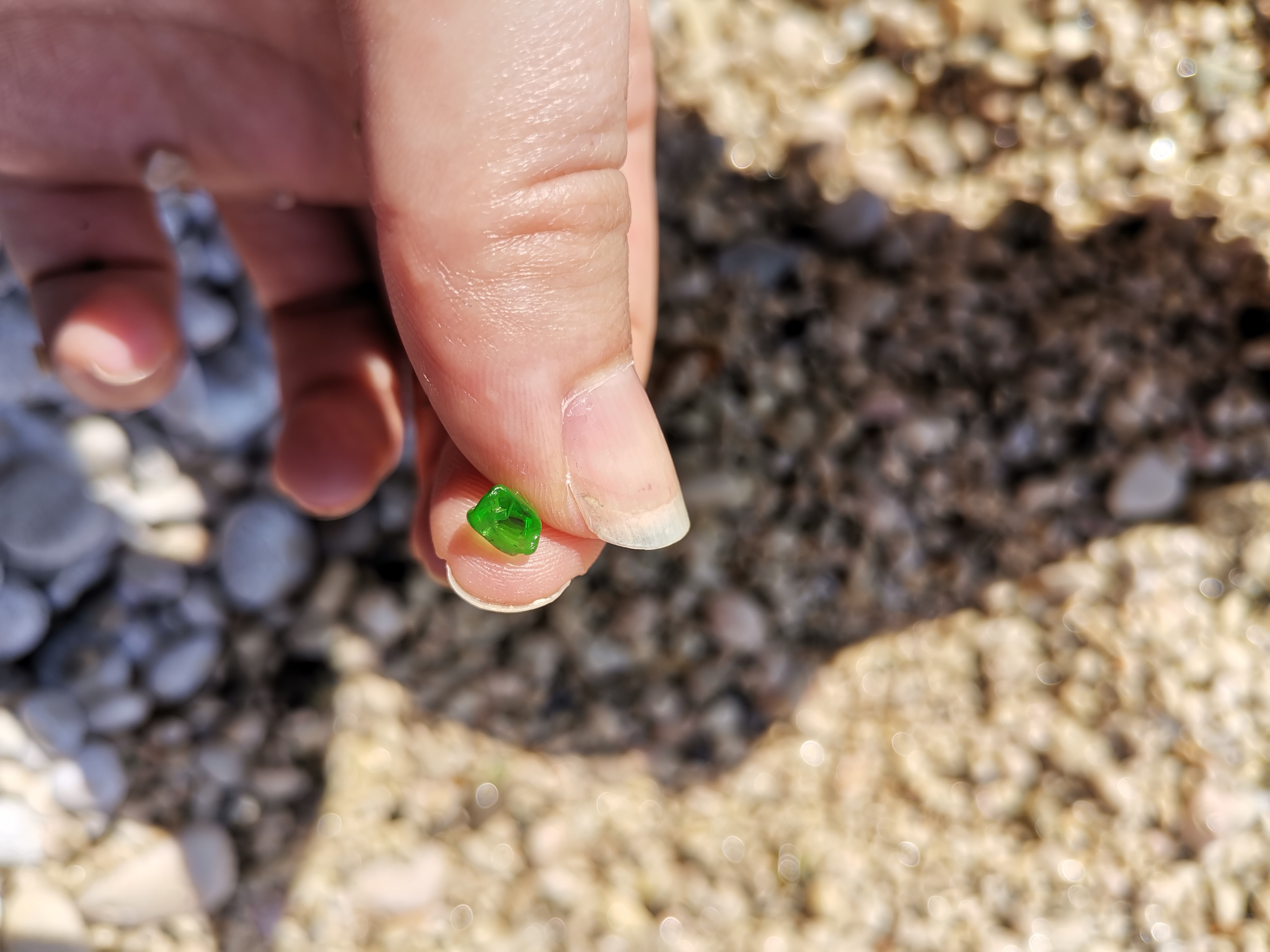 Dann, einige hundert Meter weiter, gab es dann eine kleine abgelegene Bucht. Obwohl der Hafen nur zwei Buchten weiter war, hat man ihn überhaupt nicht gesehen. Die Felsen ragten an beiden Seiten der Bucht hinaus ins Meer und wir waren sehr beschützt, ohne Wind!, auf einem steinigen Stück Strand. wir sind sofort bis zu den Knien ins Wasser, aber es war eiskalt. Das ist nichts, was man lange aushält.
