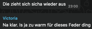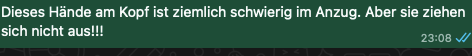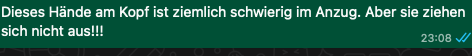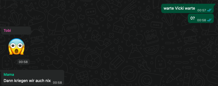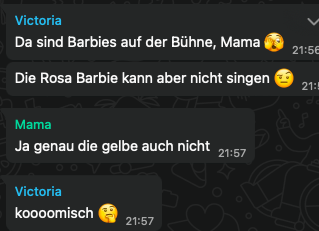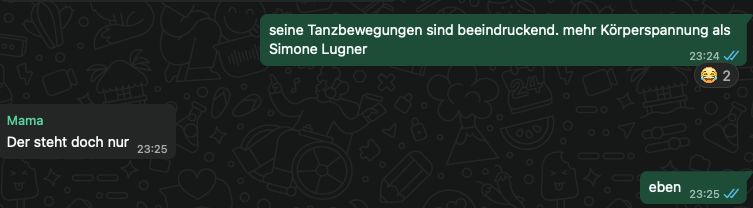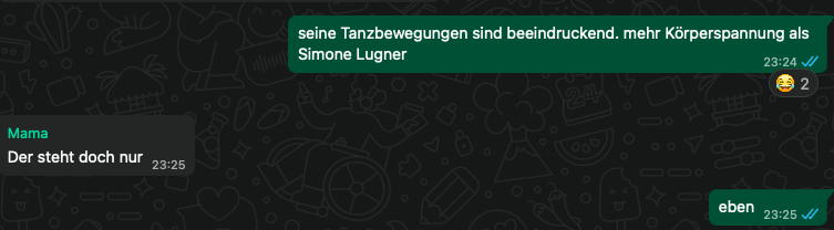 Wir lieben Song Contest schauen und noch mehr: darüber lästern. Das ist uns sehr wichtig. Allerdings hocken wir jetzt nicht mehr in einem Raum, sondern in vier verschiedenen. Das ist beim Lästern eher unpraktisch. Deshalb machen wir das jetzt über WhatsApp. Leider mussten wir dabei feststellen, dass meine Schwester mit allem eine Minute früher als mein Streaming dran ist und meine Mutter sogar zwei Minuten später erst das Bild bekommt, das meine Schwester kommentiert. Unpraktisch, aber kann man nicht ändern.
